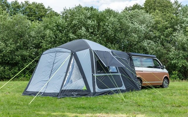 You are travelling with your bus and are looking for an awning that gives you maximum flexibility at your holiday destination? Then the Liberta-L Rear is the right choice for vehicles with a height of 180-205 cm! The rear tent Liberta-L Rear is an inflatable, free-standing awning with crossed poles. Thanks to the air poles, the rear tent can be erected quickly and easily. To attach it to the vehicle, simply pull the connecting sluice over the rear of the vehicle and fasten it with the tensioning strap. This enables universal use on different bus models (please note the mounting height).