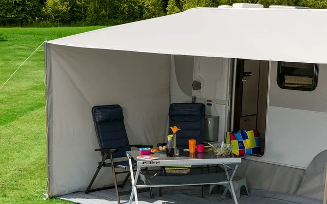 Versatile sun canopy. Can be put into various positions and therefore provide a side panel to the right or left.
