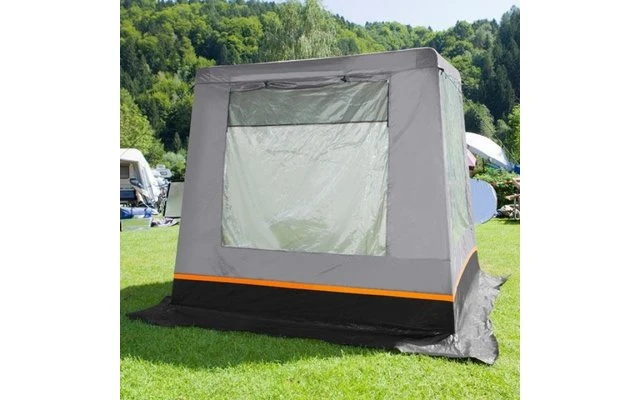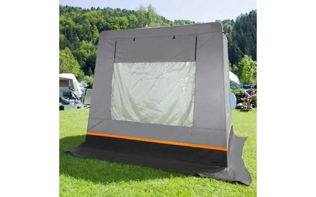 Closable top ventilation on the front panel. Entrance can be folded out and used as a sun canopy. Mosquito screen ventilation on the rear panel (closable from outside). Interior cover flaps for all three windows. Includes two practical organisers. Scope of delivery: tent, steel frame, fastening materials.