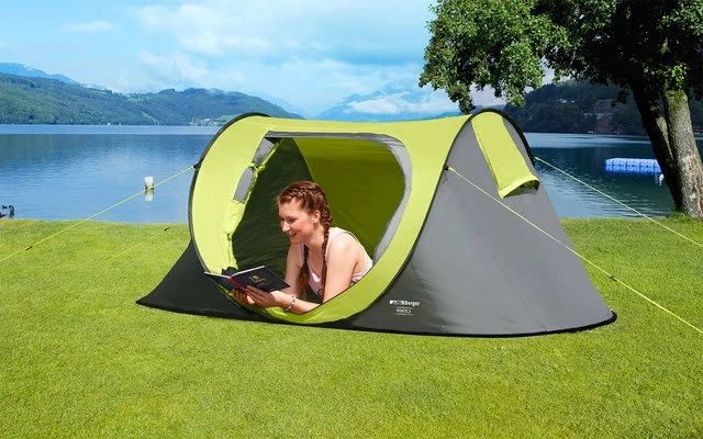 Extremely lightweight, single-walled pop-up tent for mild summer nights. Two side ventilation panels. Mosquito net ventilation on entrance.