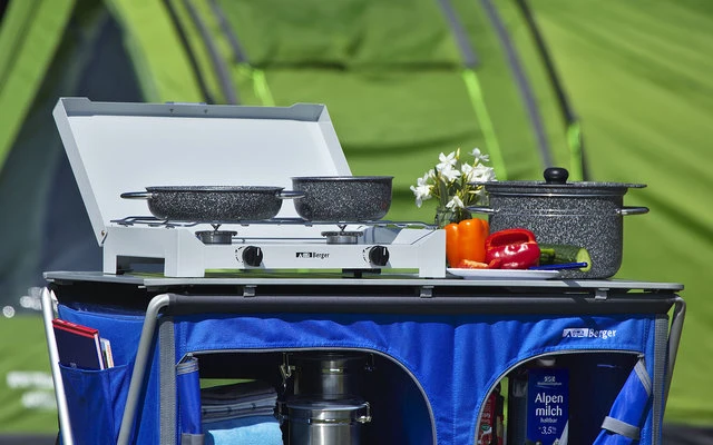 Pan set made from high-quality aluminium, non-stick coating and granite-effect. Easy to clean. The extra large colander for pasta or vegetables can be used as a steamer. Space-saving stacking system. Delivery incl. handle and strap.