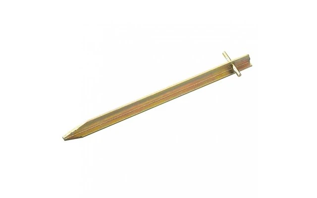 The tent securing device for stormproof tensioning. Robust and stable. To be knocked in with an iron hammer. T-profile steel 20 x 20 x 3 mm, gold-colour finish.
